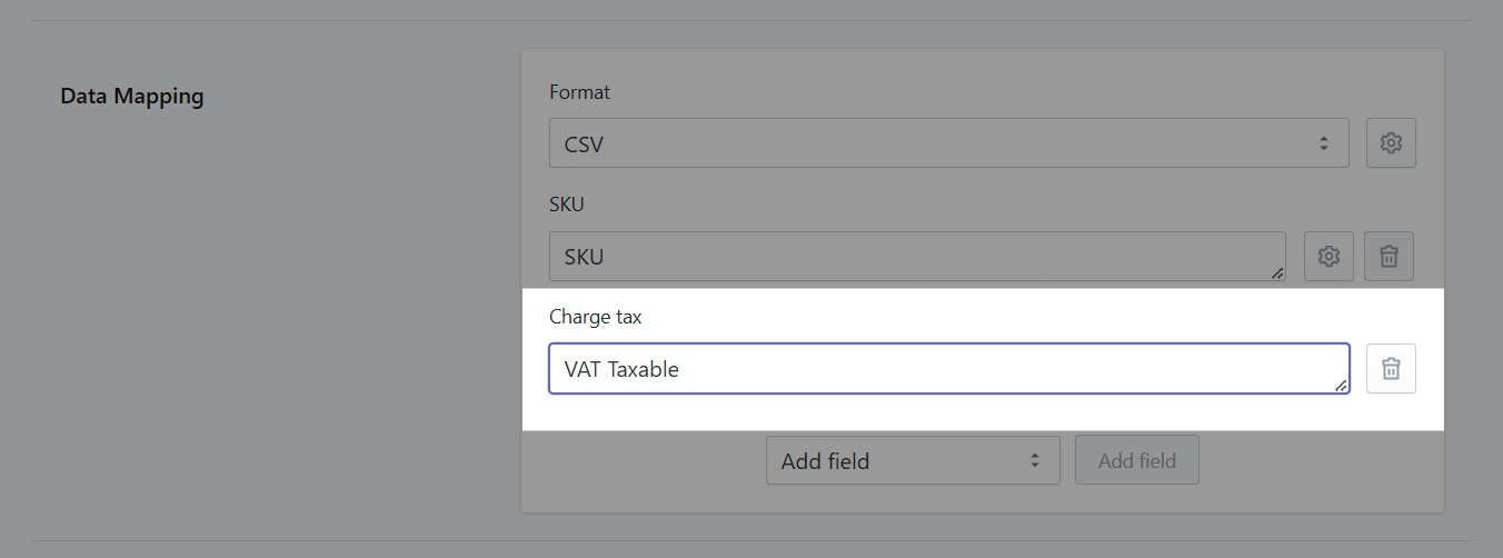 In the Data Mapping section, open the Add field dropdown, and select "Charge tax". Then specify the field in your product feed that determines whether a product is taxable.