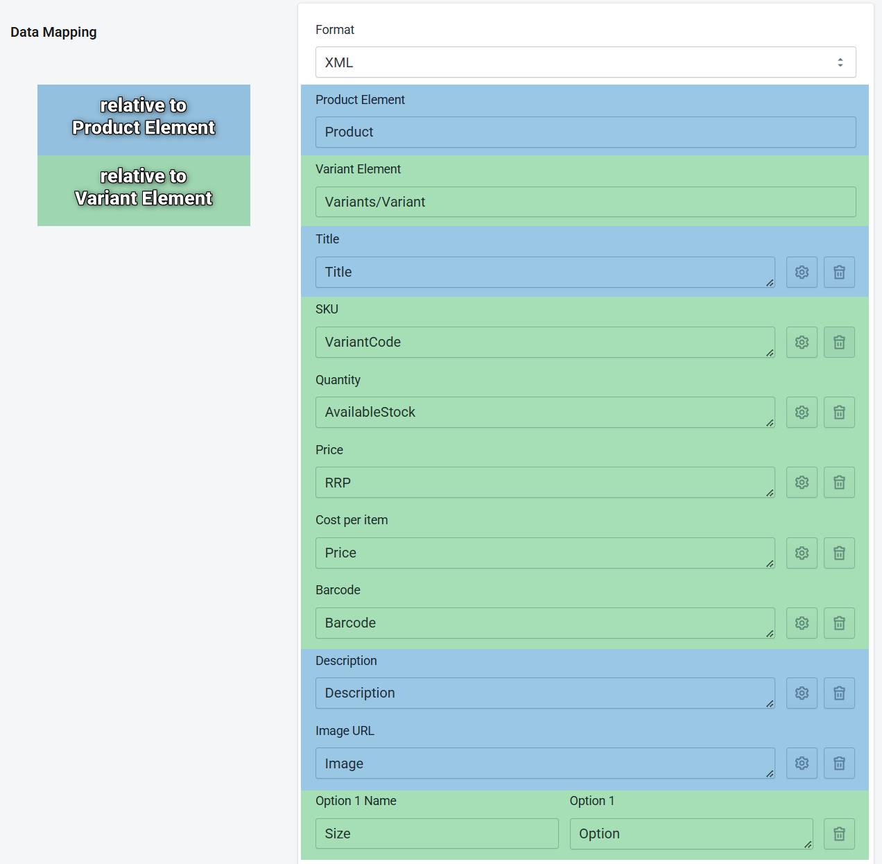 An example feed mapping, where variant nodes are embedded within product nodes, may look as follows: